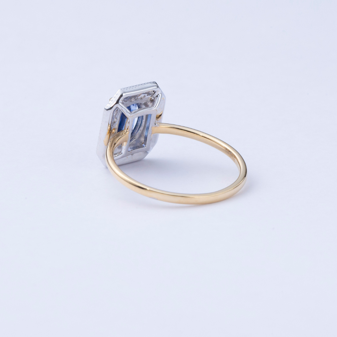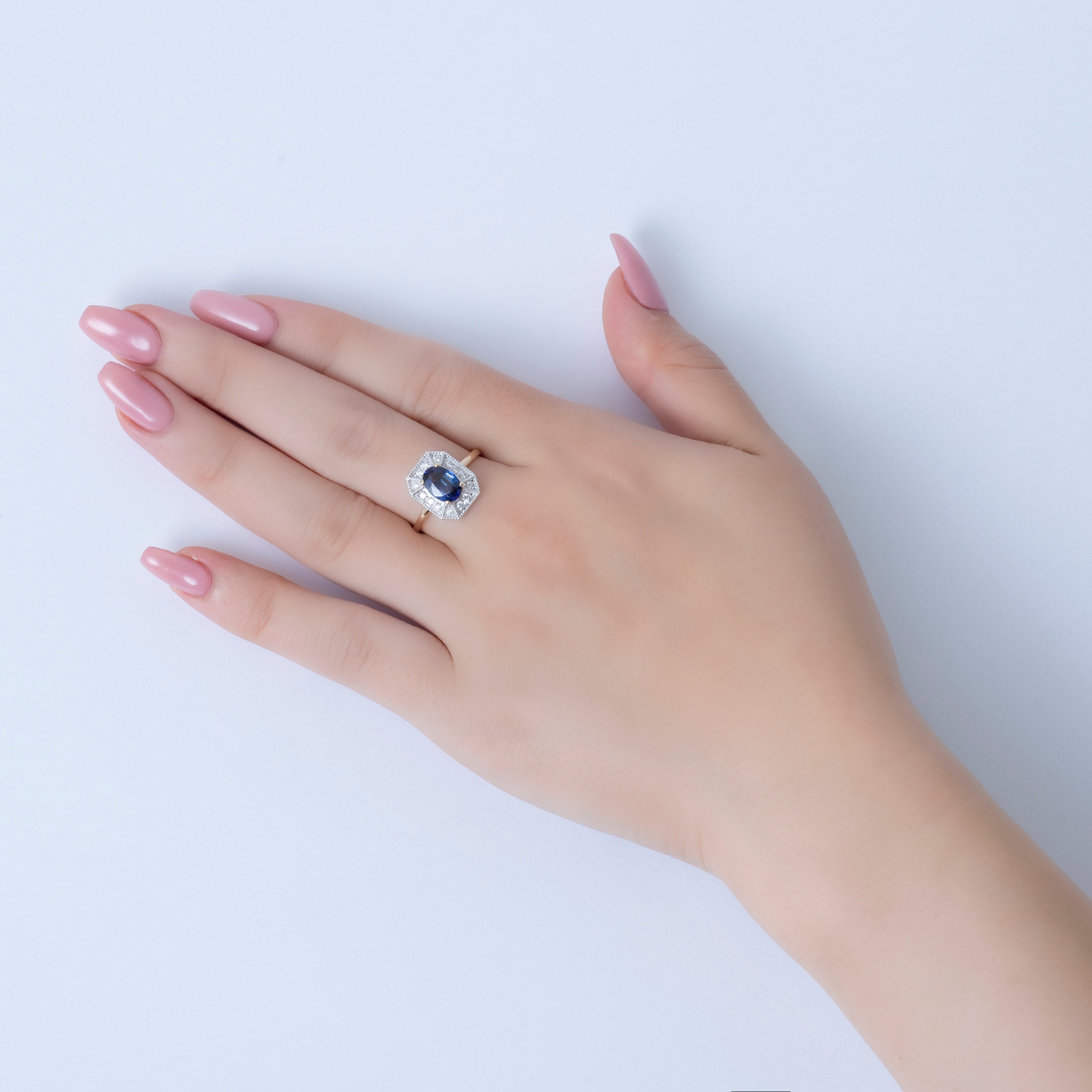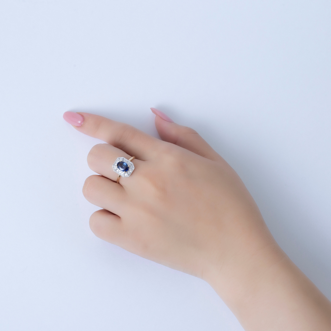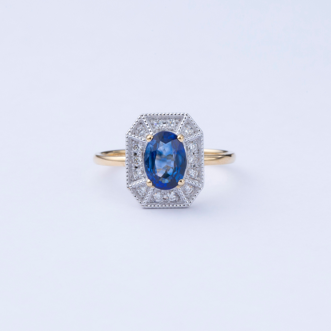 サファイアの深い澄んだ青に、繊細な輝きを添えるダイヤモンドの取り巻き。