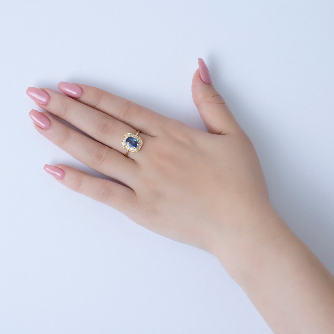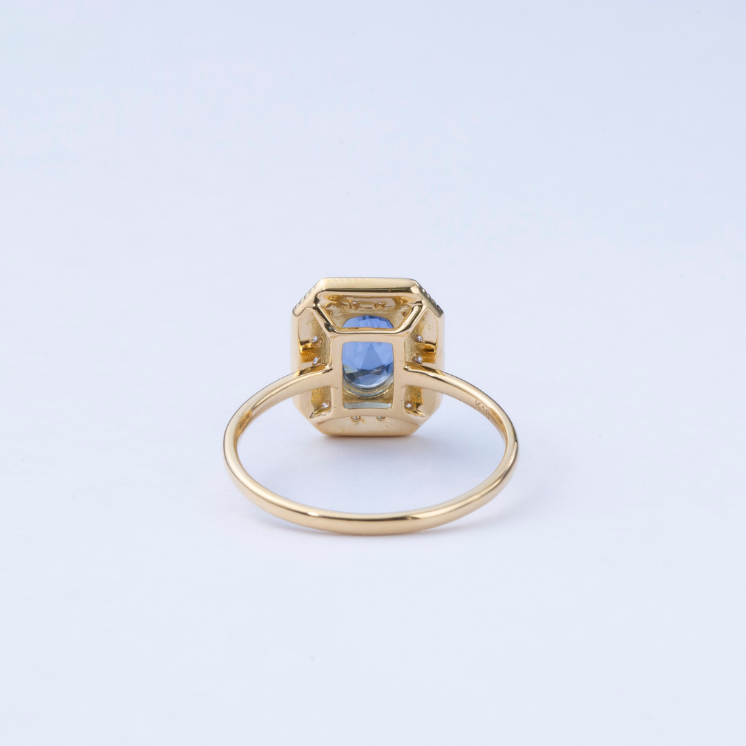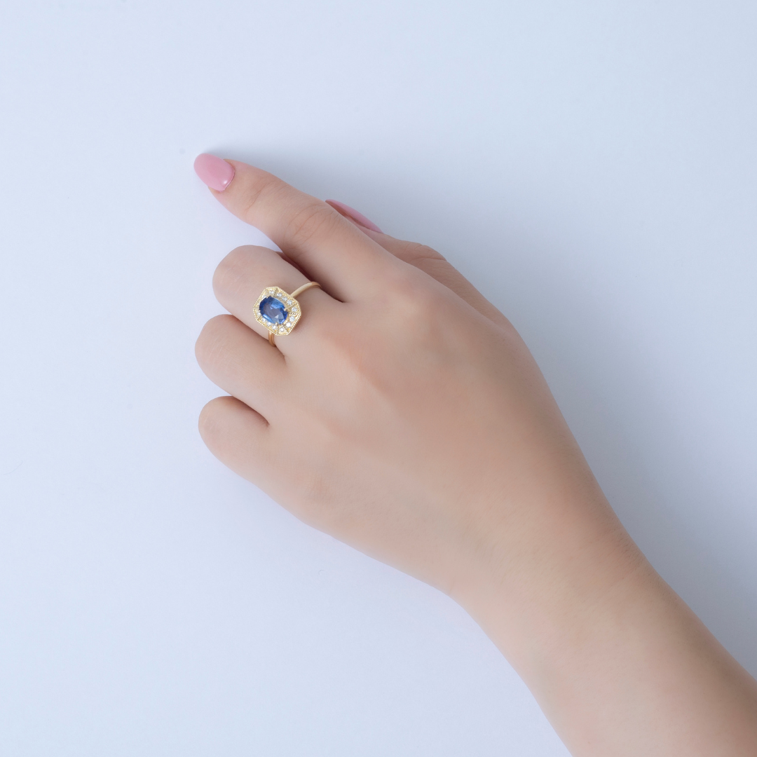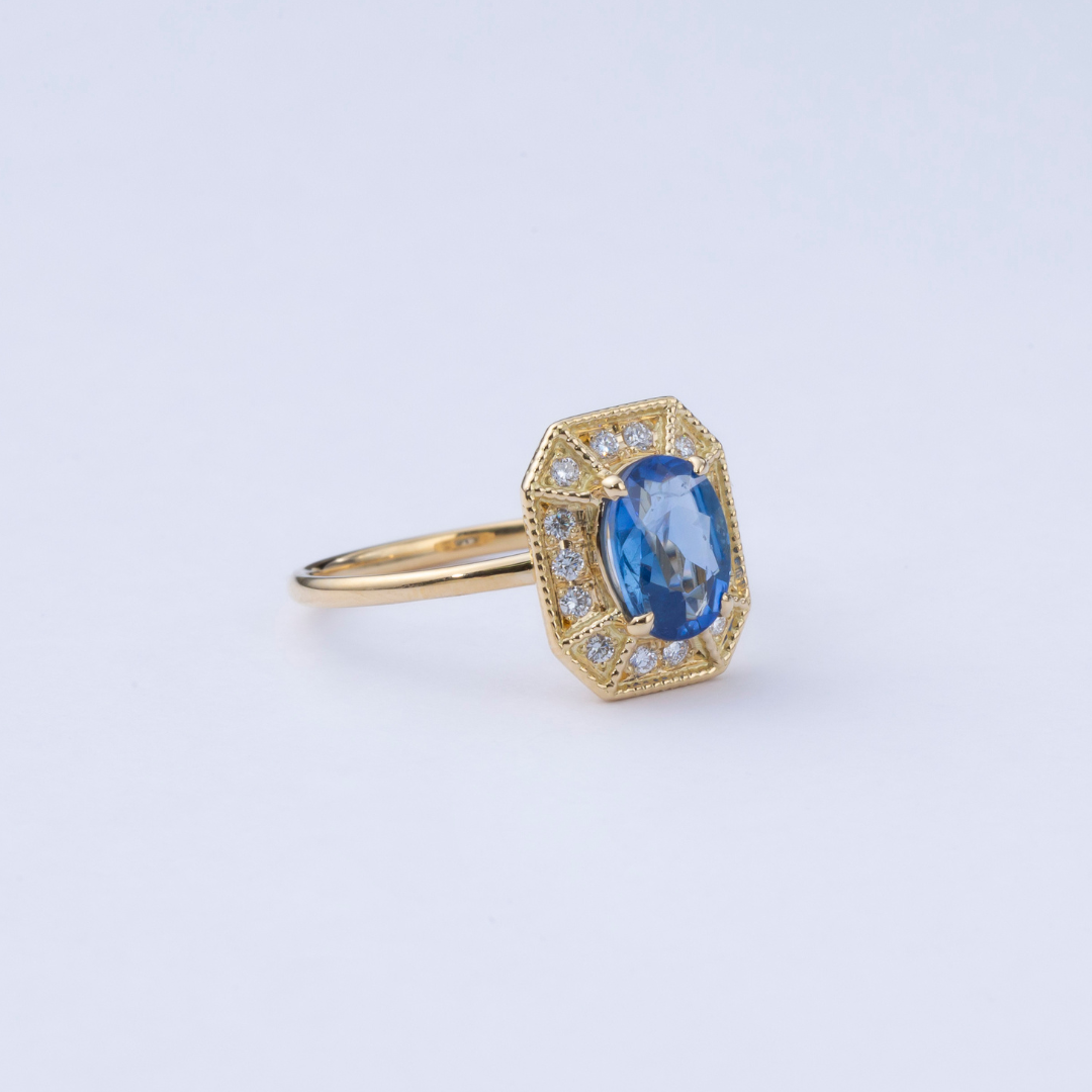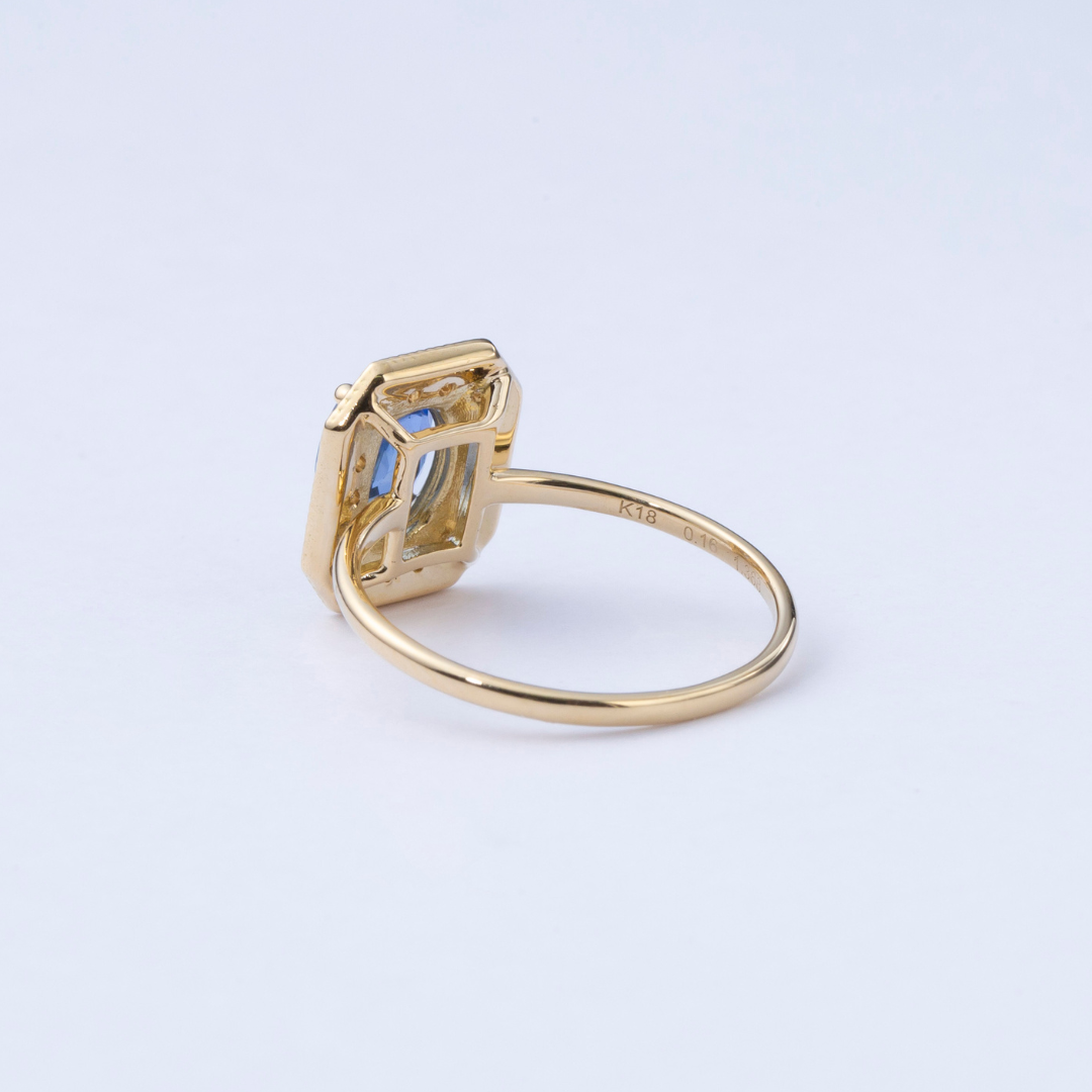 サファイアの深い澄んだ青に、繊細な輝きを添えるダイヤモンドの取り巻き。