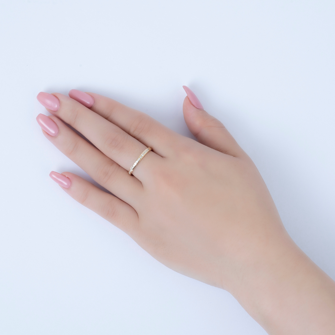 繊細なダイヤモンドのきらめきを、流れるようなラインに沿って丁寧にあしらい、指先にすっとなじむ上品な佇まいに仕立てました。