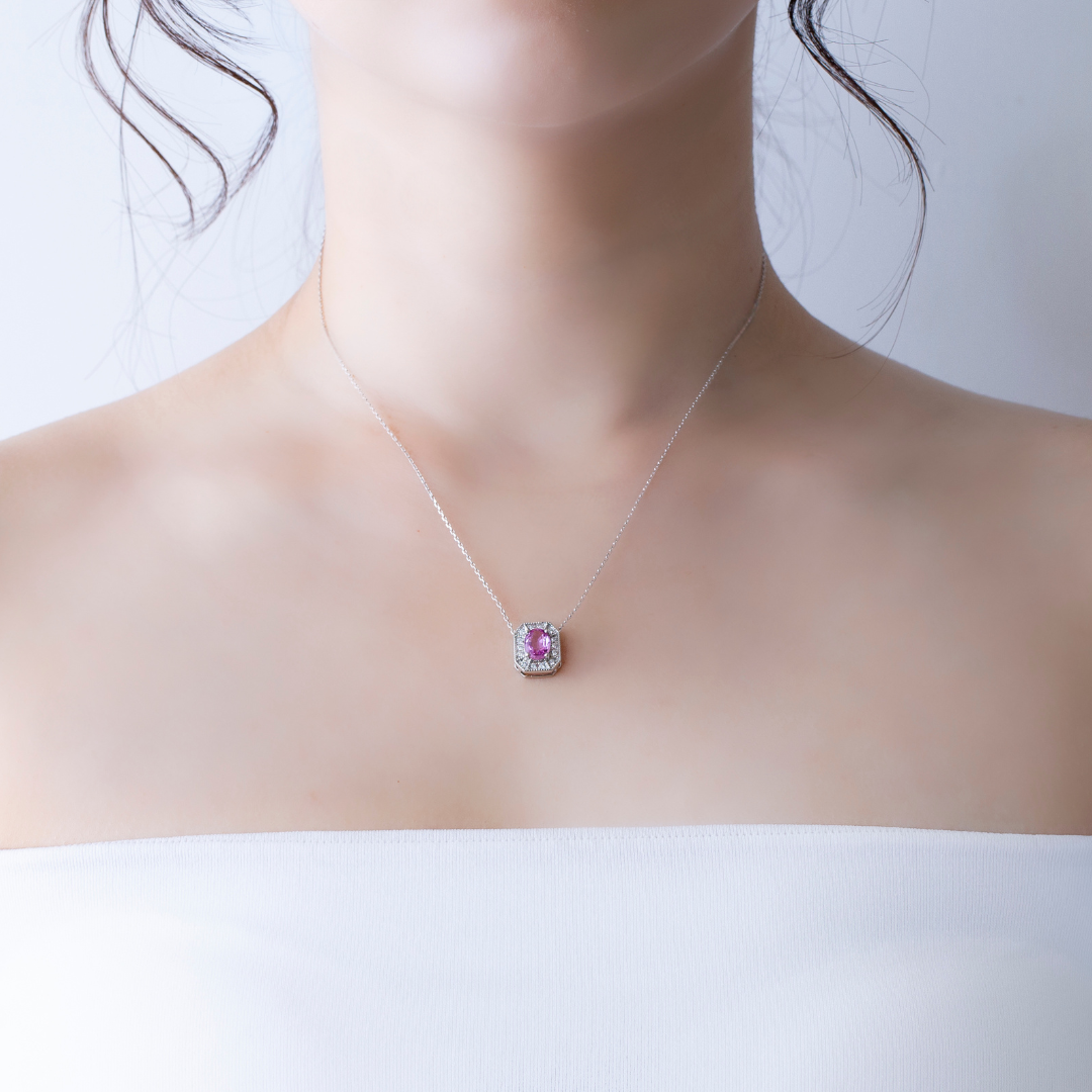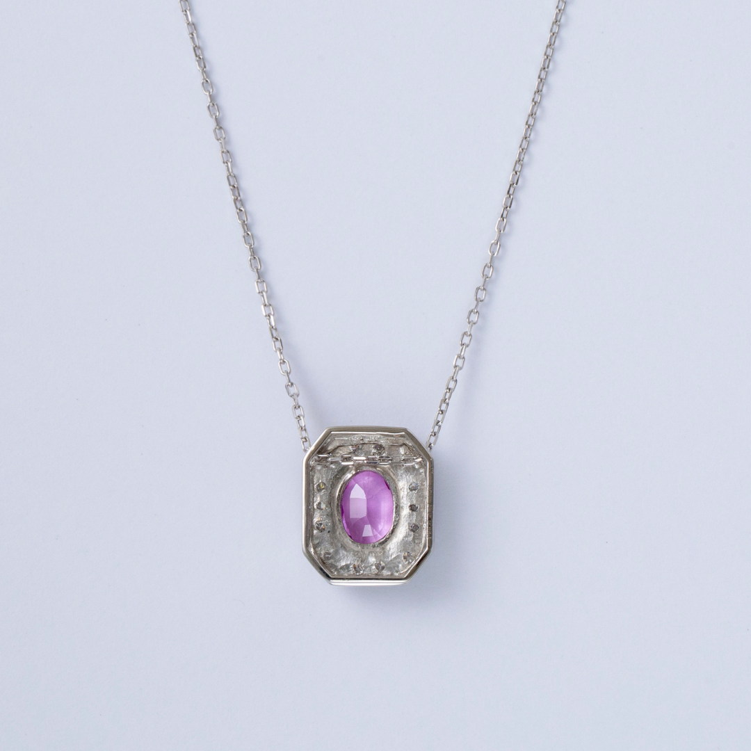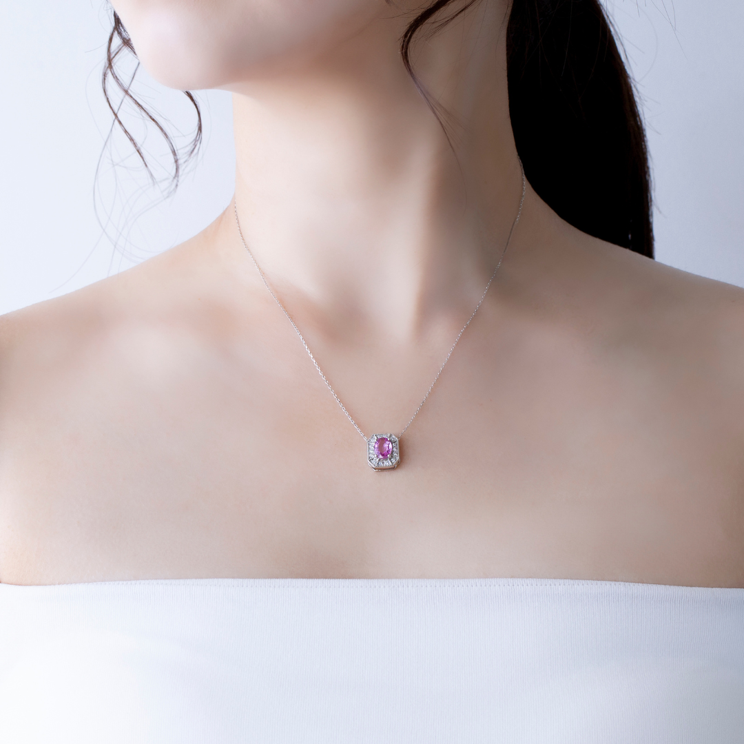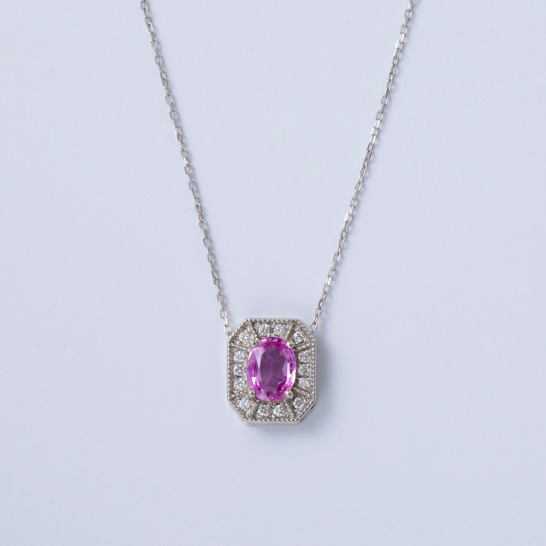やわらかな印象のピンクサファイアに、繊細な輝きを添えるダイヤモンドの取り巻き。