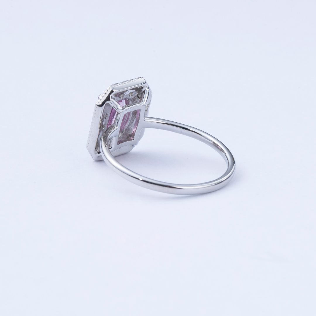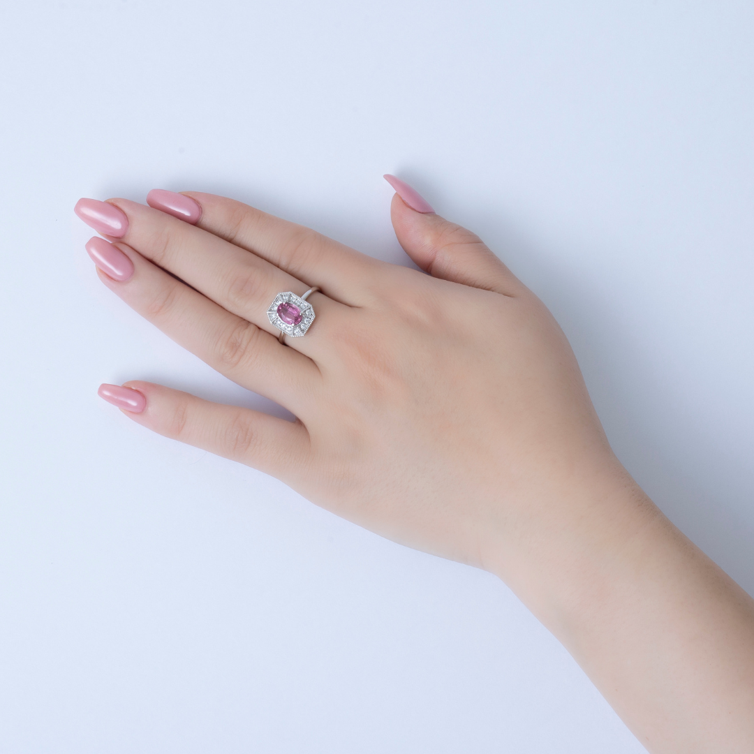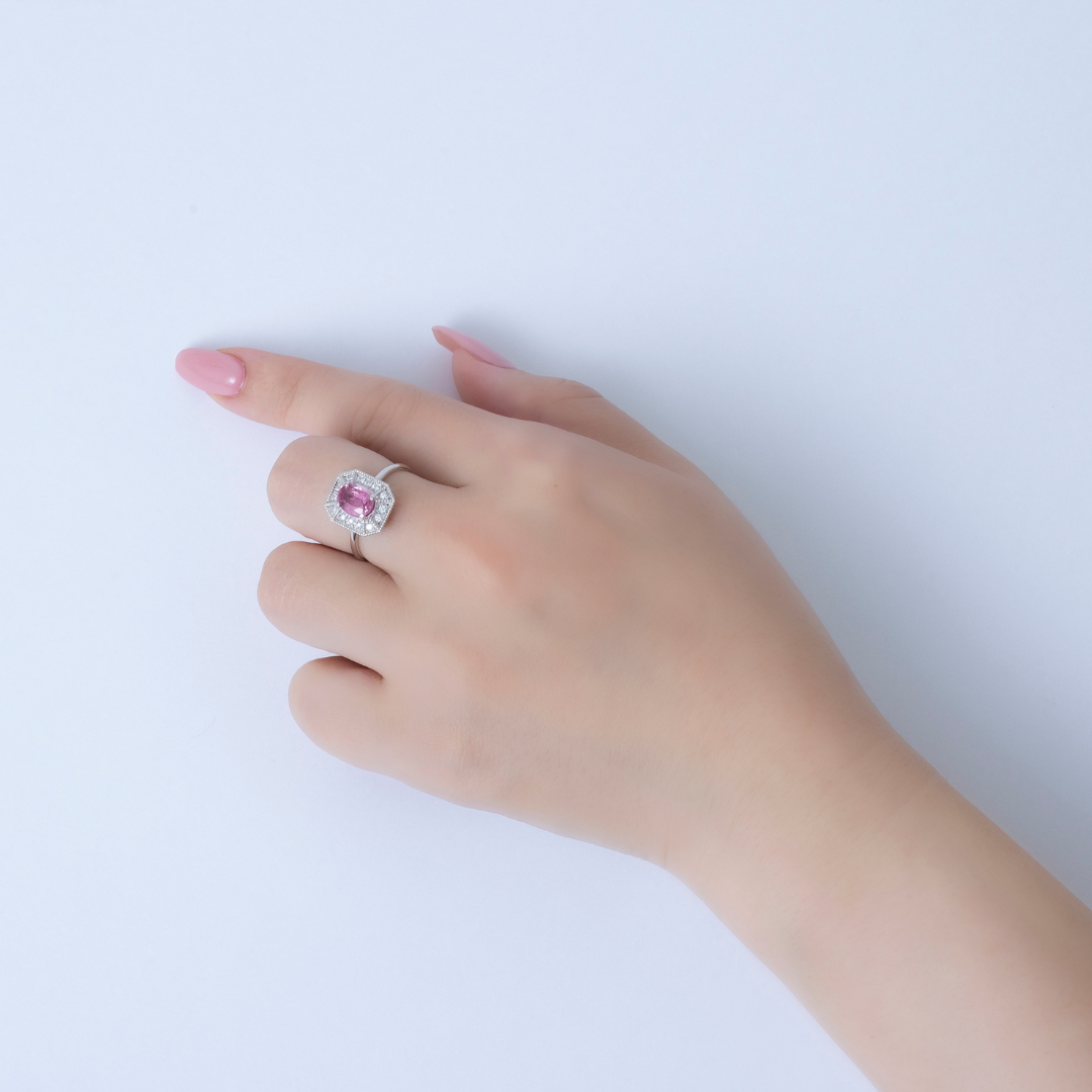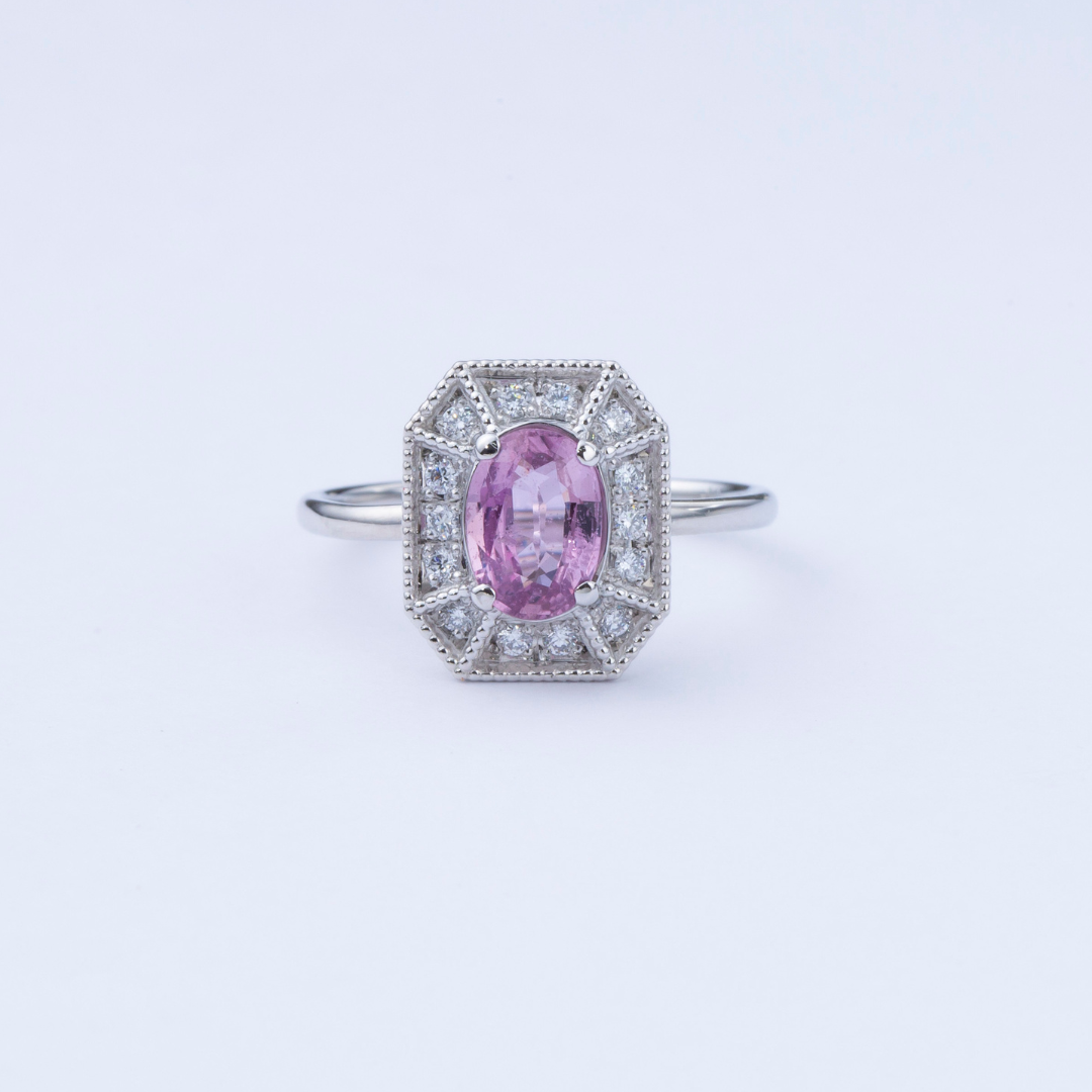 ピンクサファイアの柔らかいピンクに、繊細な輝きを添えるダイヤモンドの取り巻き。