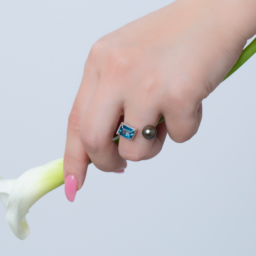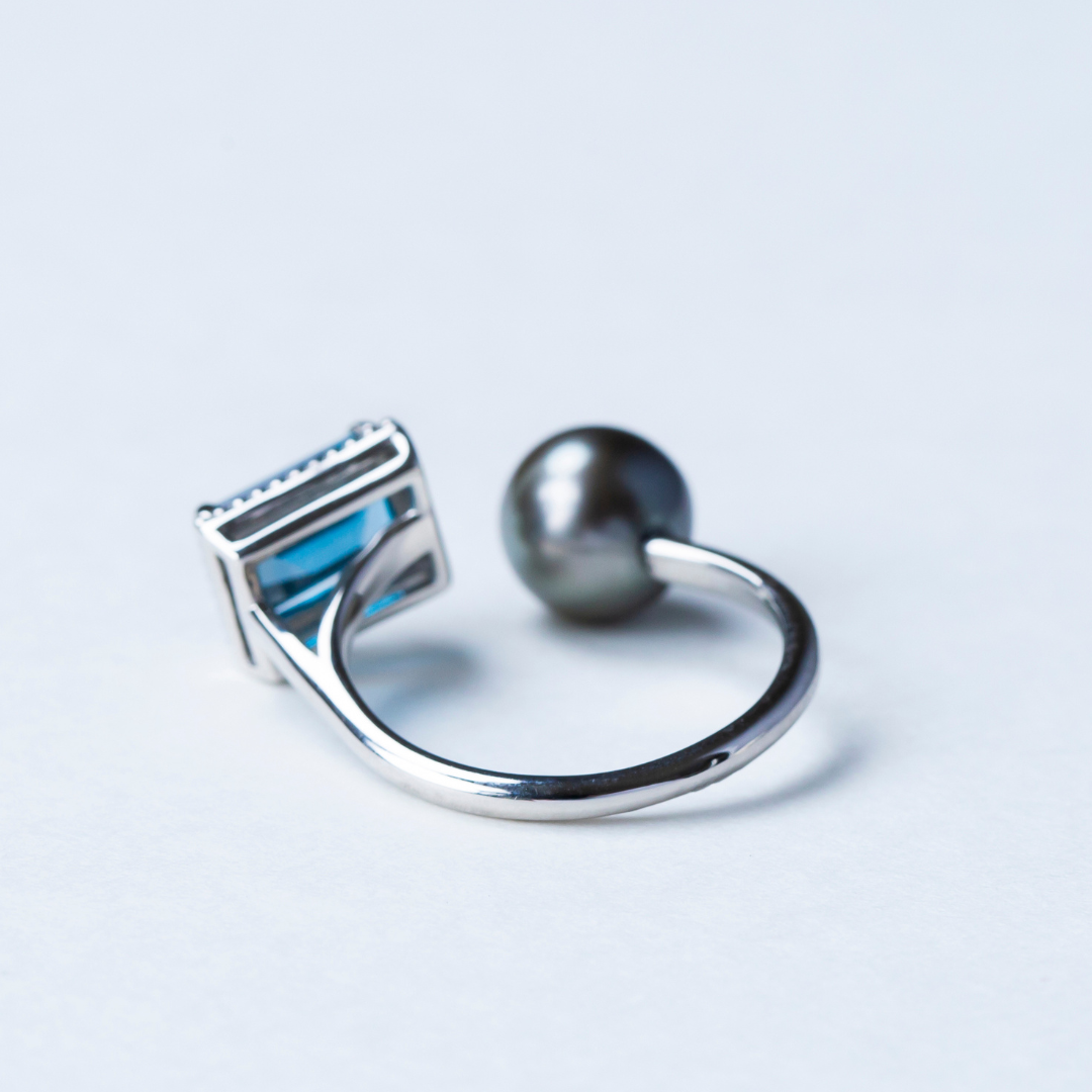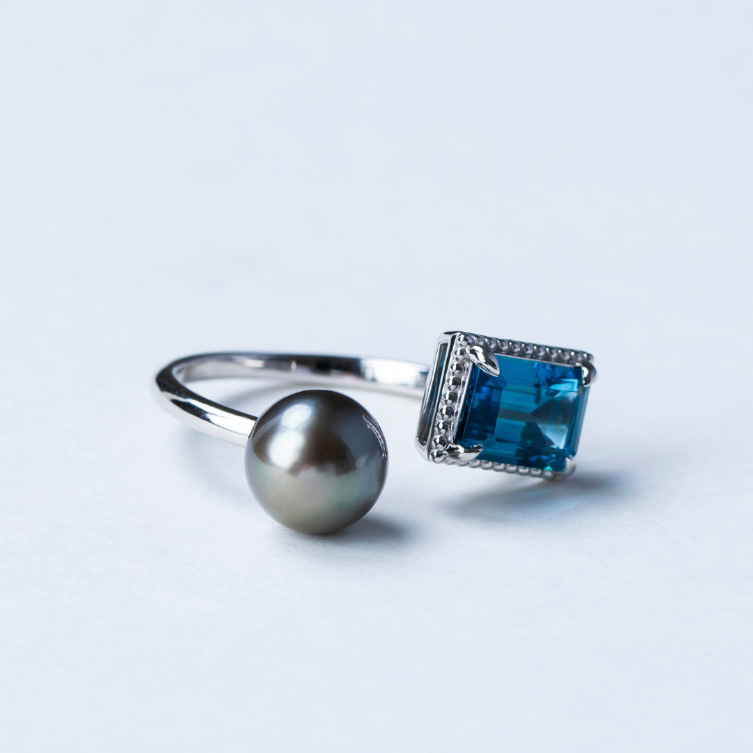 エメラルドカットのロンドンブルートパーズと、柔らかな艶を放つ黒蝶。